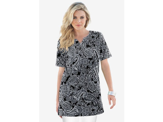 Black Lace Paisley Print Notch-Neck Soft Knit Tunic PSW-6826