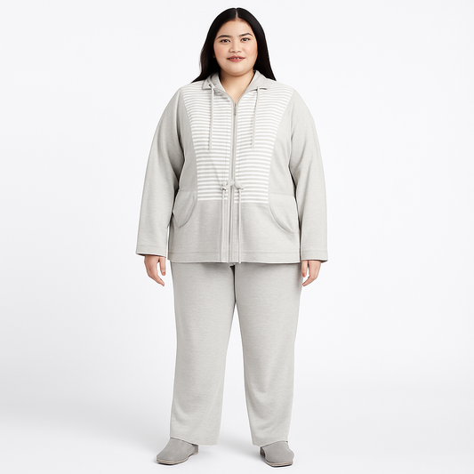 Light Grey Striped Plus Size Zip-Up Panel Lounge Set PSW-9678
