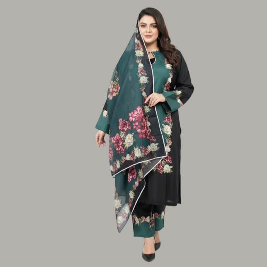 Emerald Noir Floral 3-Piece Cotton Silk Suit PSW-10095