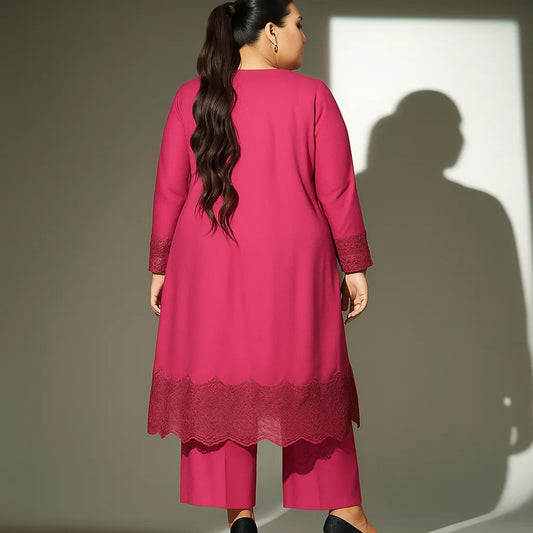 Crimson Bloom – Plus Size Stitched Lawn Suit with Black Lace (2PC) PSW-9497