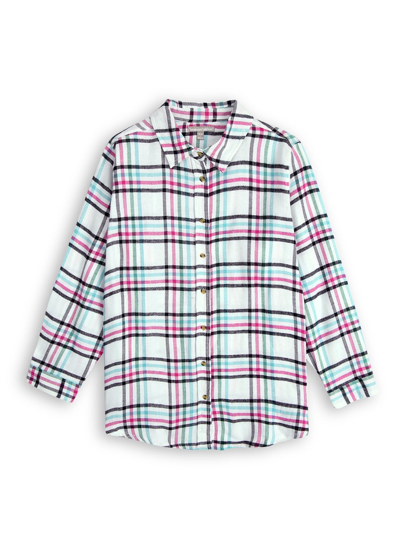 - This cotton flannel is brushed to perfection for cozy comfort. A collar, button cuffs and button front add to the classic appeal. Made in a perfect tunic length that falls over the hips.