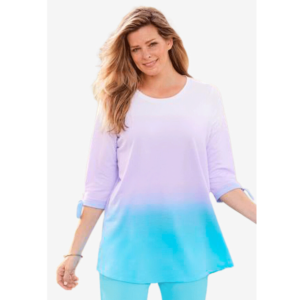 This pullover sweatshirt with a comfortable scoop neck is accented with self ties on the three-quarter sleeves. Made in a longer tunic length with a curved hem that falls over the hips, you'll love how cozy this easy French terry style is.