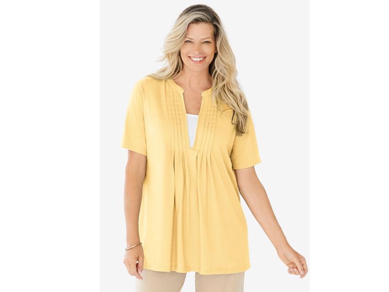An easy A-line tee with an inset at the deep V-neck to make it look like 2 tops in one! Elbow-length sleeves hit at just the right length so you stay cool and comfortable.