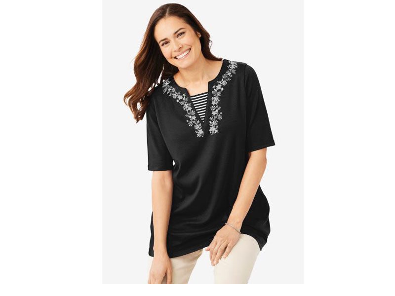 - Elbow-sleeve top with embroidered notch neck and inset for a layered look.