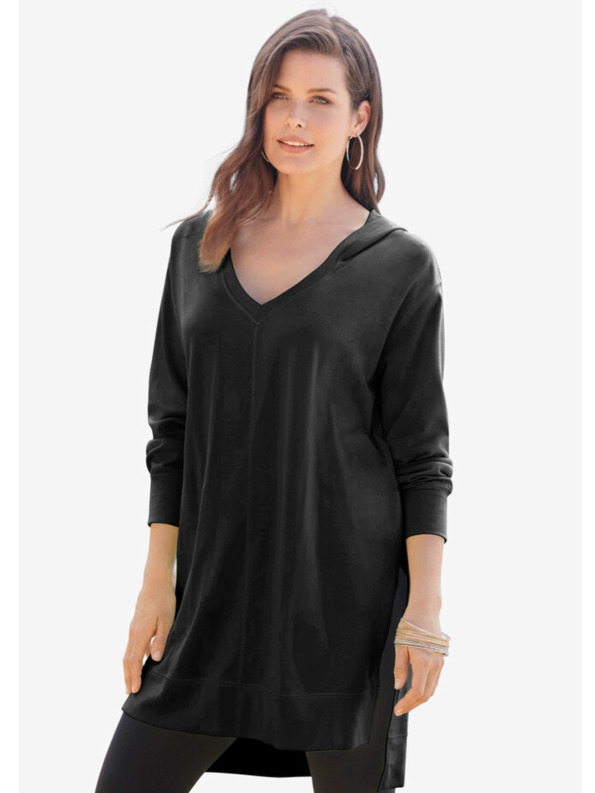 Perfect over everything, this relaxed layer features a V-neck, dramatic side slits and high-low hem. Relaxed silhouette. Center seam at front and back. Overlock stitching detail.