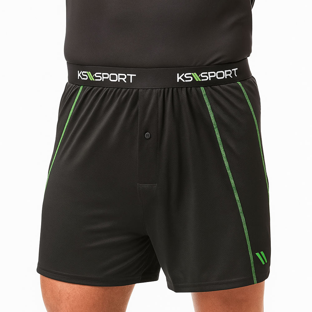 Designed for all-day performance and comfort, our Black Performance Mesh Boxers keep you cool, dry, and fresh. These boxer briefs feature breathable mesh panels for airflow, moisture-wicking and anti-microbial technology to combat sweat and odor, and a relaxed fit with a tagless finish. The button-fly front and cotton/poly blend add to their functionality and softness.