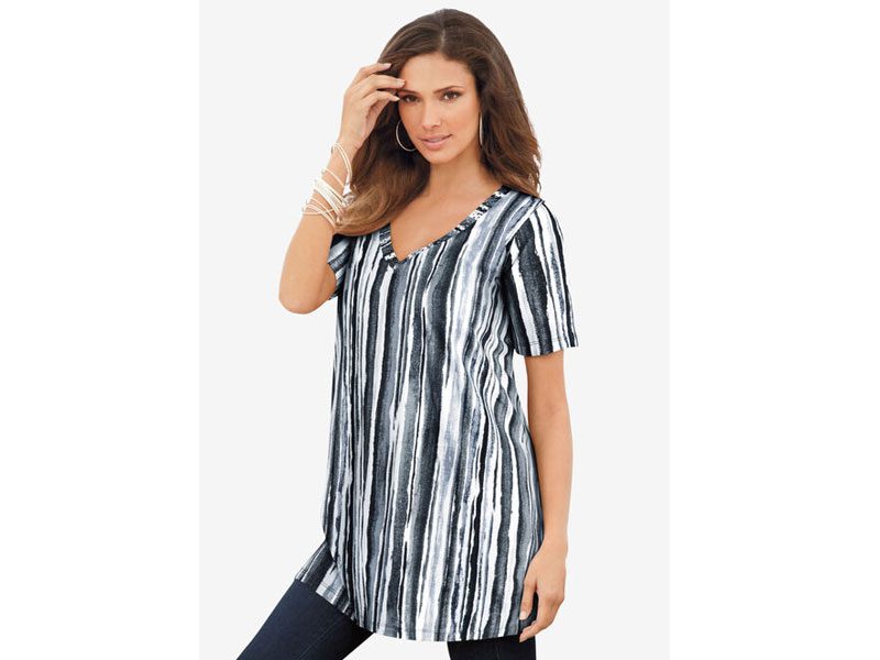 - Gorgeous tie-dye print and a studded neckline add a nice touch to this V-neck tunic, a stand-out piece you'll love. A-line silhouette. Side slits.