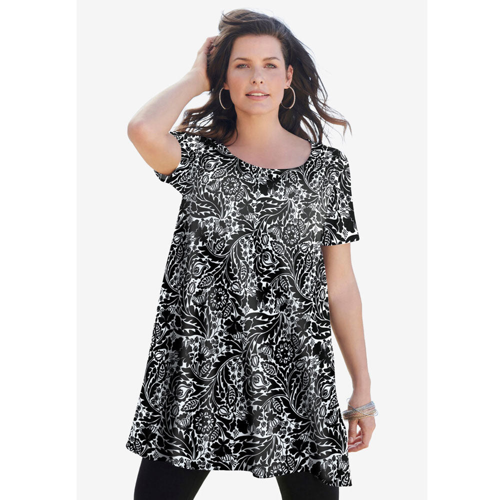Black White Floral Scoopneck Swing Ultimate Tunic PSW-8140