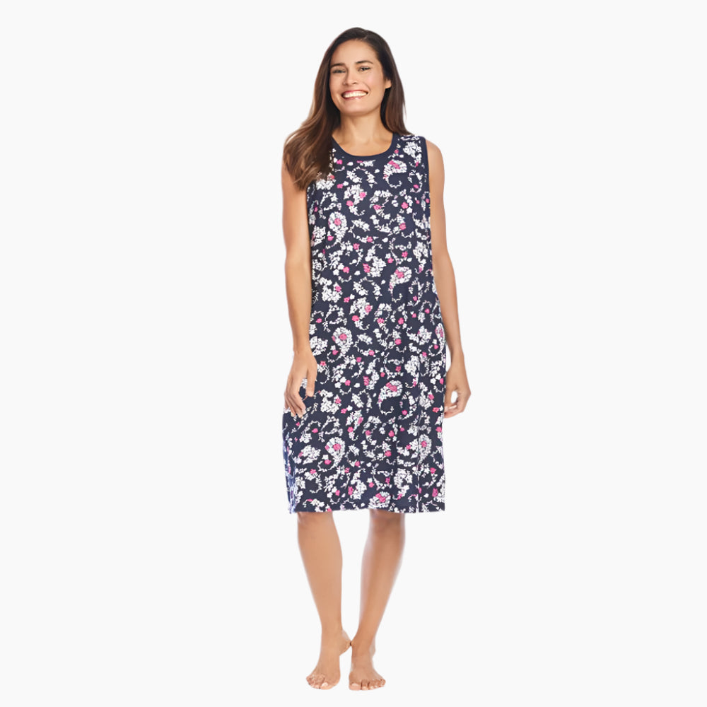 Bedtime never looked or felt so good. Sleep comfortably in this sleeveless knit chemise shirt. Relaxed scoop neckline with an A-line silhouette and tag-free comfort. 38" length A-line silhouette Scoop neck and back Tag-free comfort Pure cotton; imported Machine wash