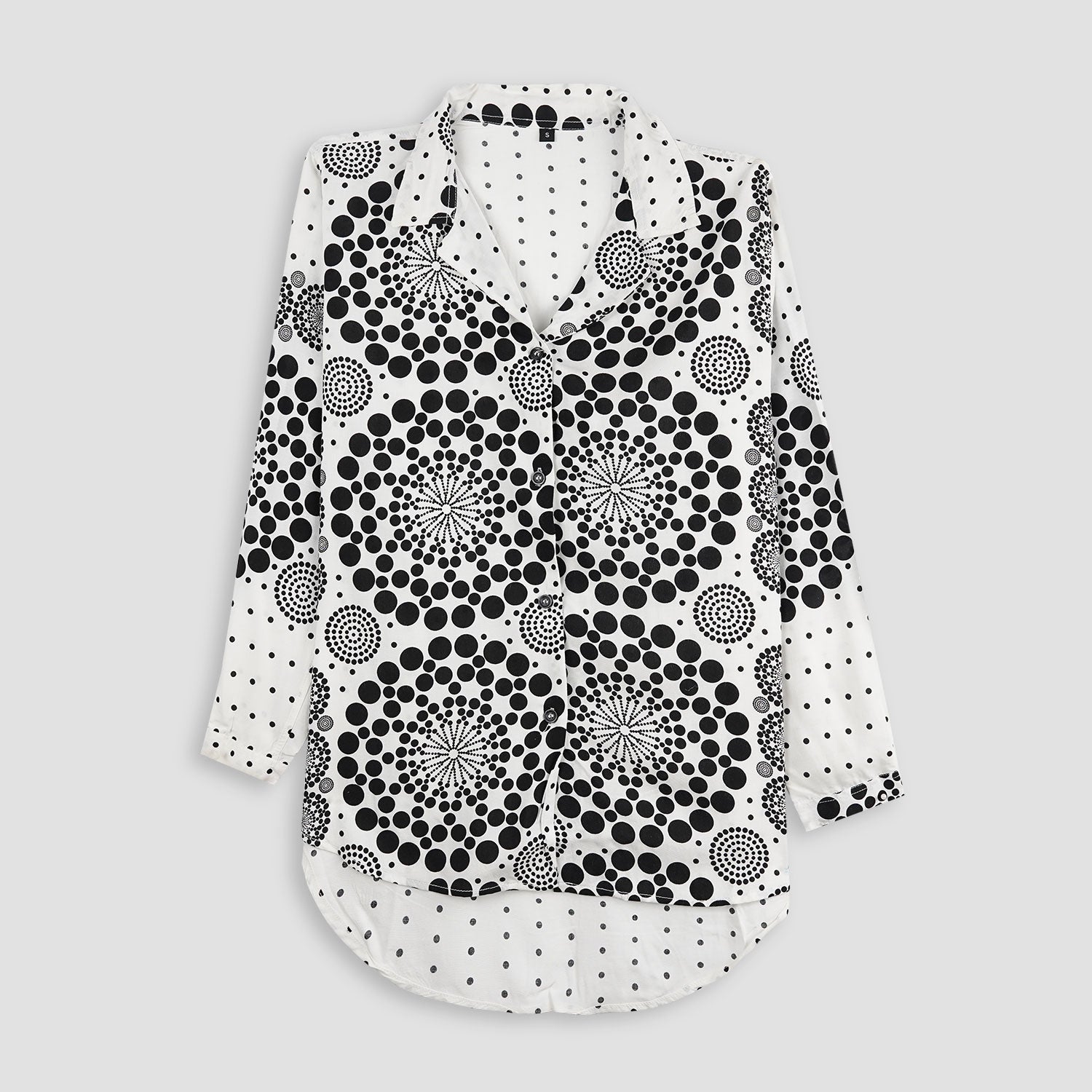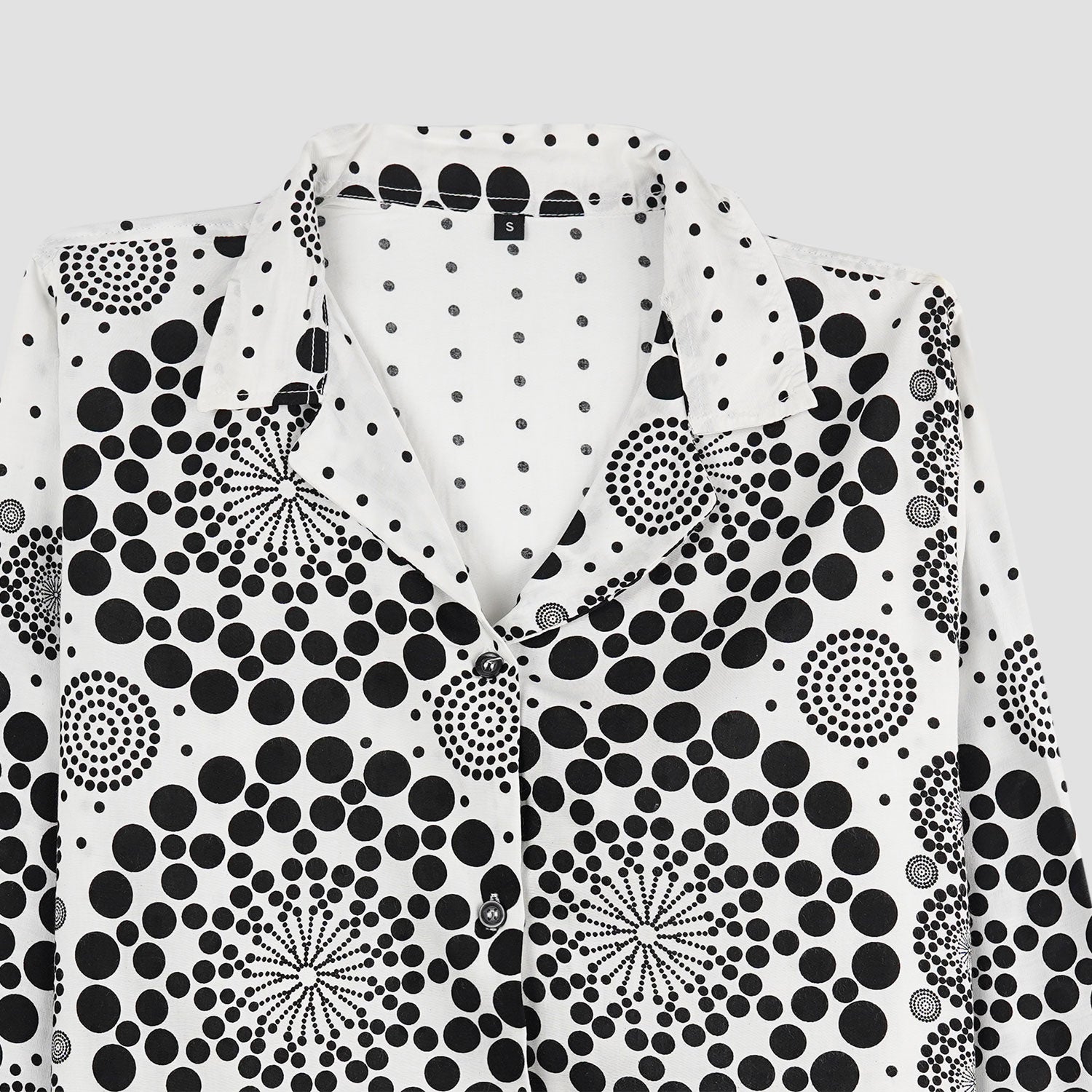 The Celestial Dots Long-Sleeve Shirt showcases an eye-catching black-and-white design with intricate dot patterns arranged in mesmerizing mandala-like formations. Crafted from soft, breathable fabric, this shirt combines comfort with a chic aesthetic. The contrast between the bold central patterns and subtle polka dots on the sleeves and hem adds a modern twist to a classic look.