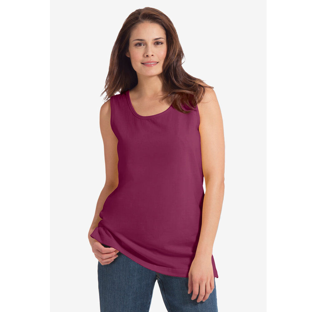 This classic tank top is a wardrobe must-have. Its simple, scoopneck design and wide straps offer a comfortable and flattering fit. The longer hemline adds a modern touch. Perfectly coordinated with our crochet cardigan, but versatile enough to wear with anything.
