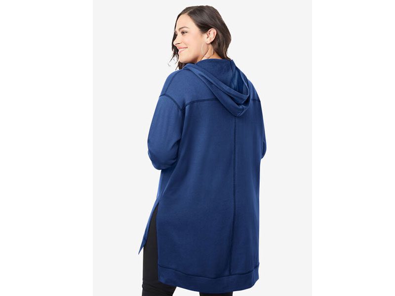 Perfect over everything, this relaxed layer features a V-neck, dramatic side slits and high-low hem. Relaxed silhouette. Center seam at front and back. Overlock stitching detail.
