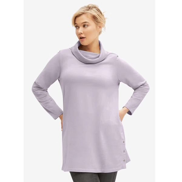 ntroducing your new favorite tunic! It’s versatile enough to dress up for casual Friday at the office or dress down for lounging on the couch. The cowl neck design is especially flattering while snap closures at the hem add a cute functional detail. Made with lightweight French terry it’s the perfect choice to keep you stylish and comfy.