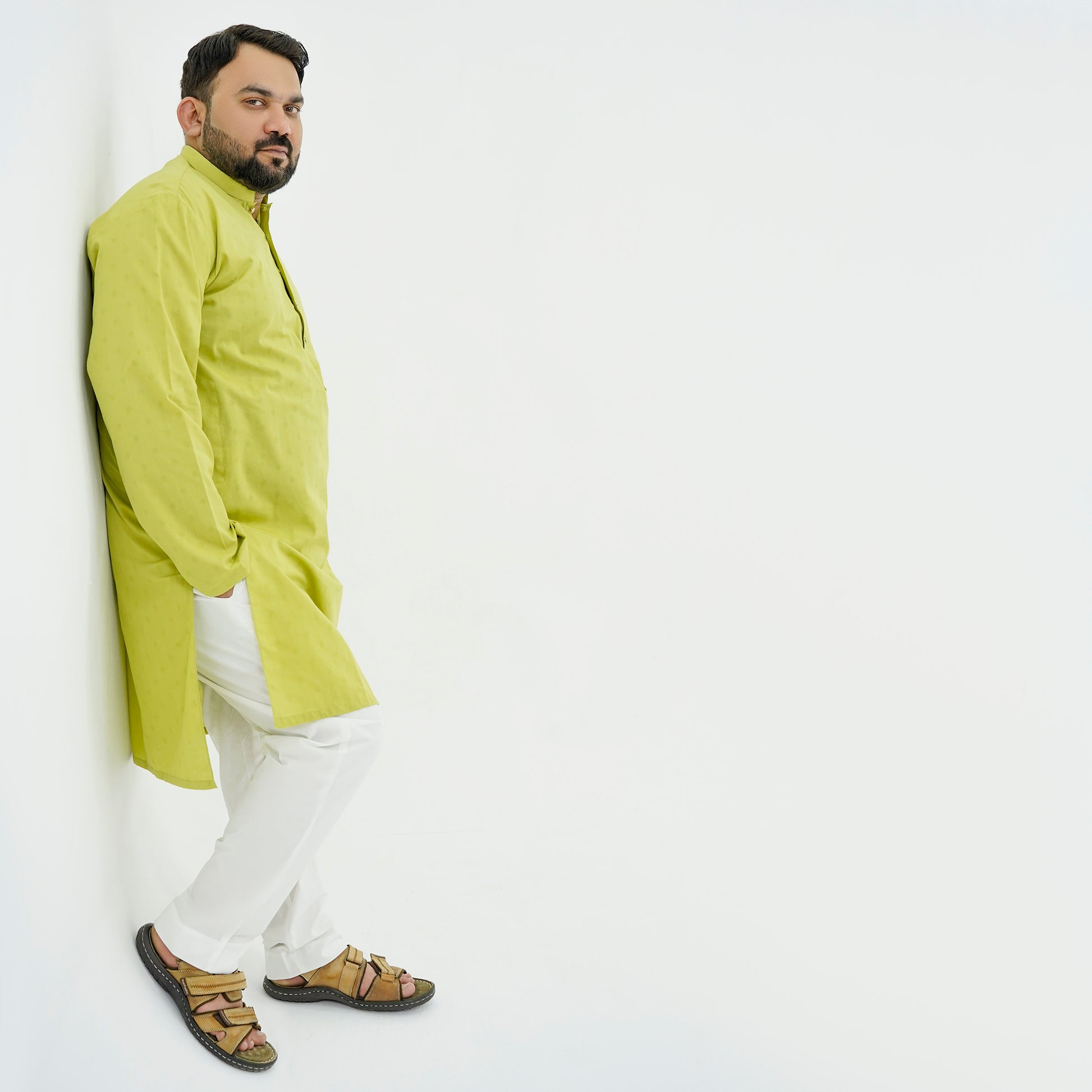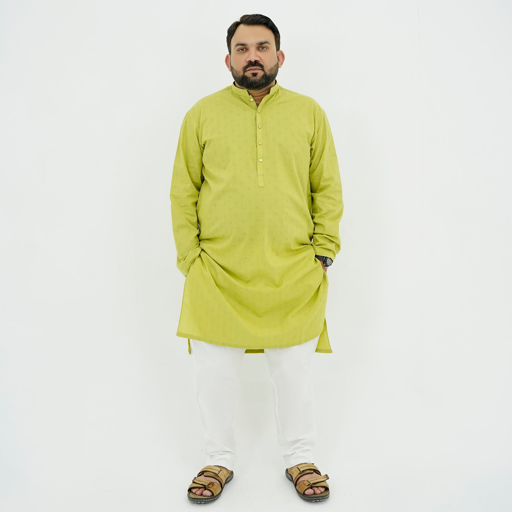 Elevate your traditional wardrobe with the Lime Green Textured Cotton Plus Size Kurta Pajama Set for Men. Crafted from premium cotton textured fabric, this set combines style with comfort, perfect for festive gatherings or casual wear. The kurta features a subtle self-textured pattern, mandarin collar, and button-down placket, while the white cotton pajama ensures a breathable, relaxed fit.