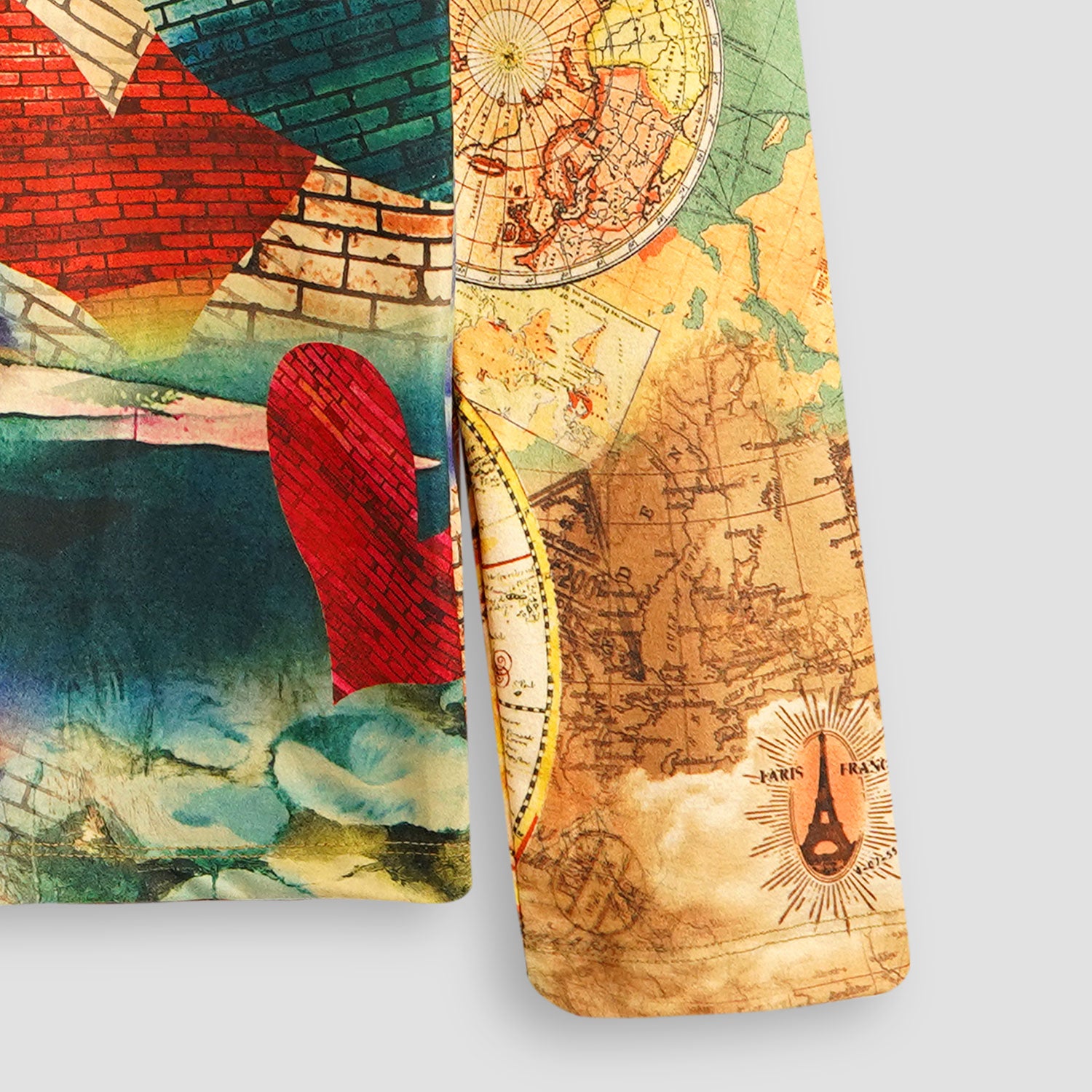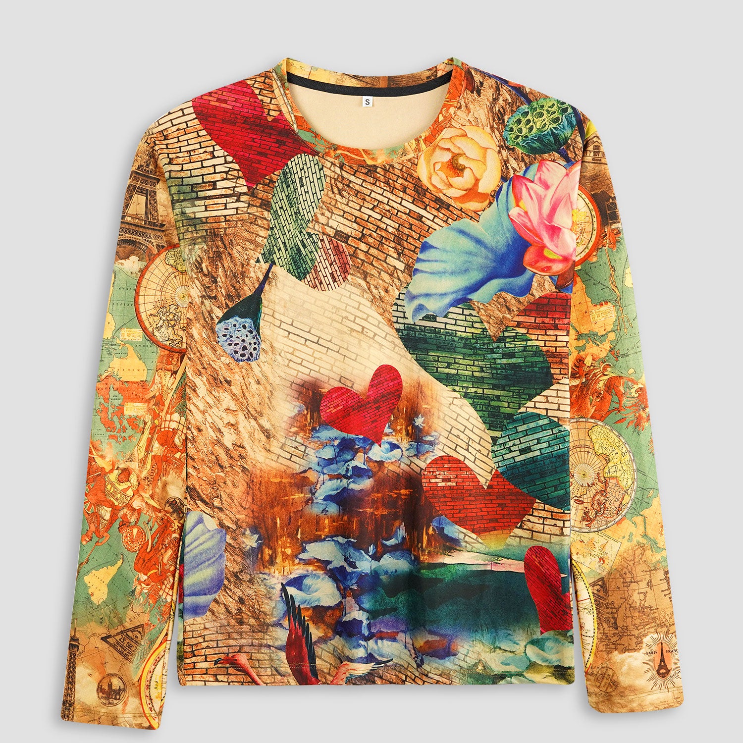 The Love in Bloom Long-Sleeve Shirt is a captivating blend of vintage maps, vibrant florals, heart motifs, and rustic brick patterns. This artistic top features a harmonious mix of earthy tones, deep reds, lush greens, and soft blues, evoking a sense of adventure and romance. The intricate design tells a story of exploration and passion, making it a perfect choice for those who love to express themselves boldly.