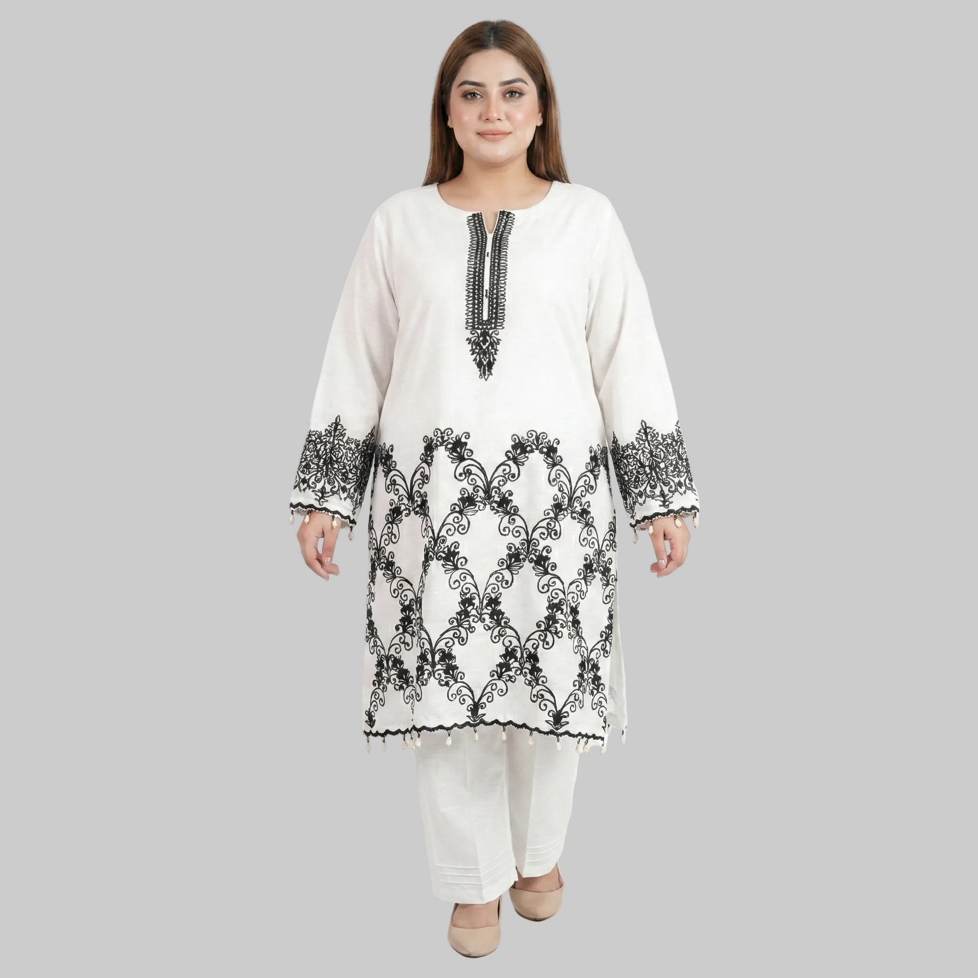 A classic khaddar 3-piece suit designed exclusively for plus size women, available in 2XL to 5XL. This elegant outfit features a finely embroidered shirt with contrasting black detailing on a soft white base. Paired with comfortable khaddar trousers and a lightweight matching dupatta, it offers both warmth and ease for winter wear.
