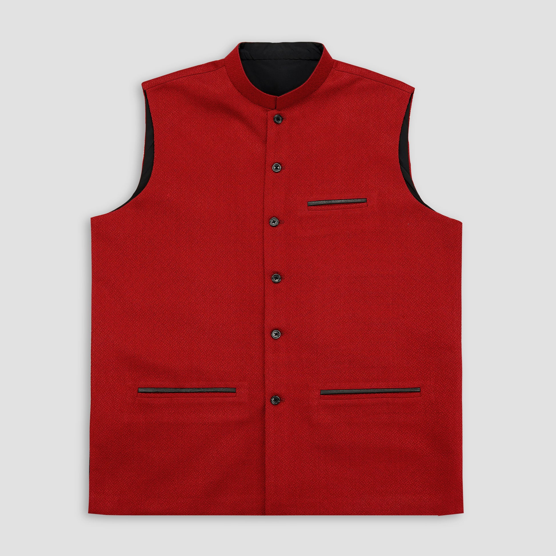 Upgrade your ethnic wardrobe with this sophisticated Plus-Size Men's Nehru Jacket in a rich red hue with black accents. Designed for comfort and style, this sleeveless jacket is tailored for plus-size individuals with a length of 31-33 inches and a waist size suitable for larger frames.