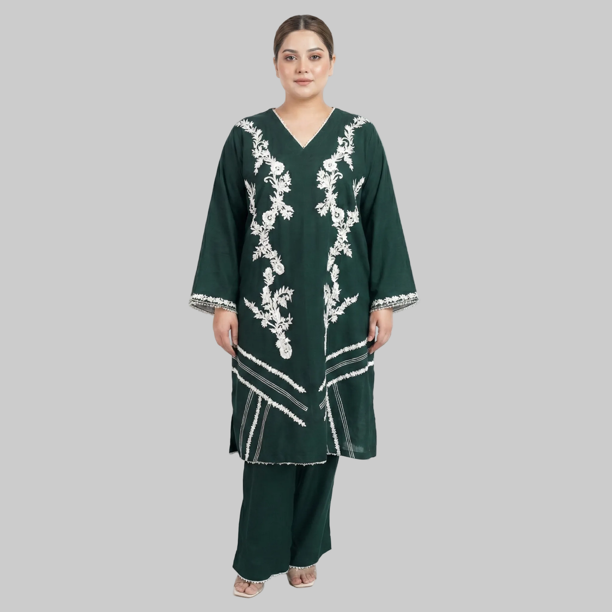 Sahar is a refined 3-piece suit made from warm, soft dhanak fabric, thoughtfully designed for plus size women (2XL–5XL). The deep forest green base is beautifully balanced with elegant white embroidery, giving a graceful and timeless look. Paired with matching trousers and a coordinated dupatta, this suit is ideal for winter wear, everyday use, and casual gatherings.