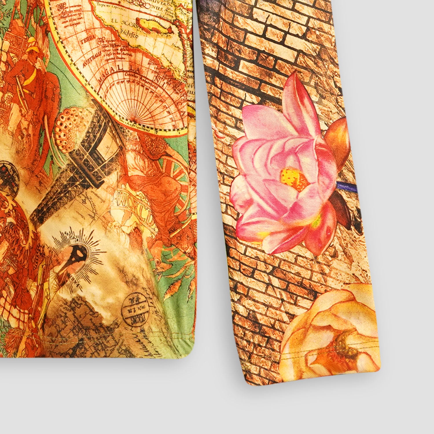 The Travel-Inspired Top Long-Sleeve Shirt is a statement piece for those who are passionate about exploration and world travel. This shirt features an eye-catching print of vintage maps, globes, and iconic landmarks such as the Eiffel Tower, evoking the spirit of adventure and discovery. Intricate details like compass roses, celestial symbols, and floral accents add a touch of old-world charm, making this top both unique and timeless.