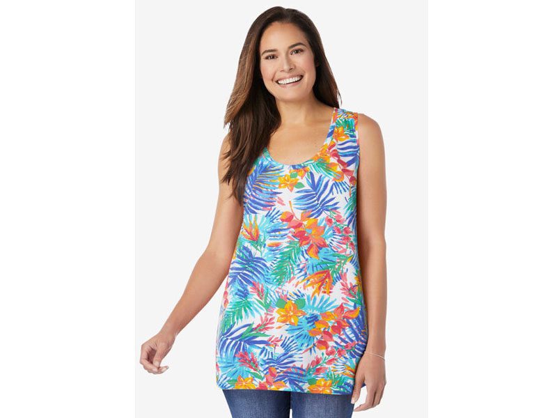 Fun tropical vacation motifs add a touch of cheer to any summertime look. This high-low knit tank is so easy to wear and has a longer back for a little extra coverage.- High-low front length: 28", back length: 30"